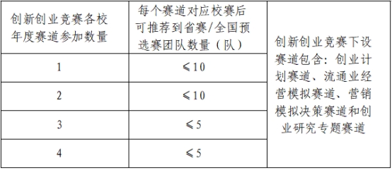由学校统一组织,具体形式以赛前通知为准,拟于6月份举行,选拔优秀团队晋级全国预选赛。校赛不收费。校赛后可推选不超过50%且不超过10队的参赛团队晋级参加省赛/全国预选赛,如果参赛院校只选择参加创新创业竞赛内1-2个赛道,则校赛后此1-2个赛道推选合计总队数不能超过20队(且单赛道不超10队);如参赛院校选择参加创新创业竞赛内3-4个赛道,则校赛后多个赛道推选合计总队数不能超过20队(且单赛道不超5队),此规则创新创业竞赛内各赛道均适用。